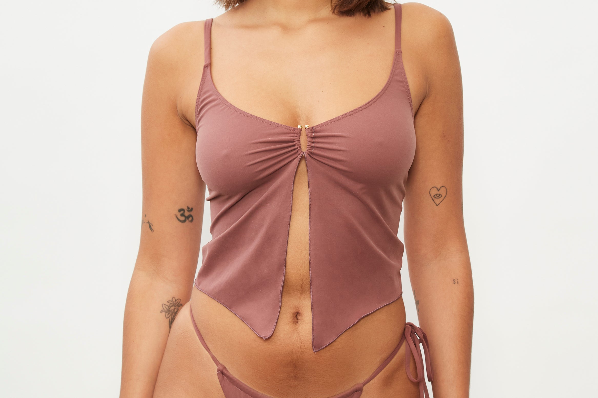 Small bikini bottom in soft brown faux suede. With a flirty ruched detail front and back. Featuring antique silver and turquoise details on the straps, and finished with a handmade fringe. Adjustable with a lace at one side.