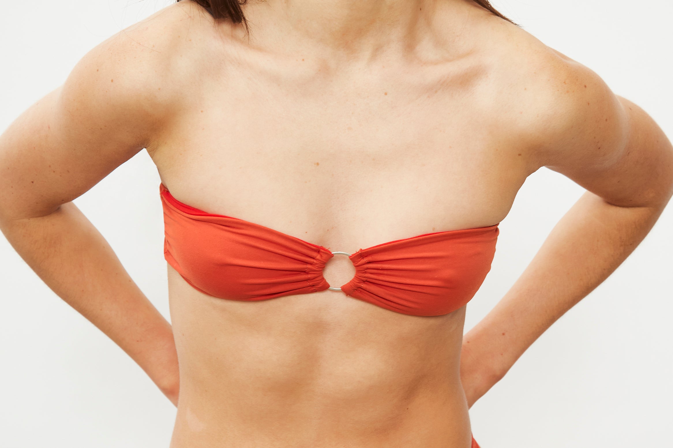 Bandeau bikini top in soft red faux suede. Featuring an antique silver ring at the front. Adjustable with a lace at the back.