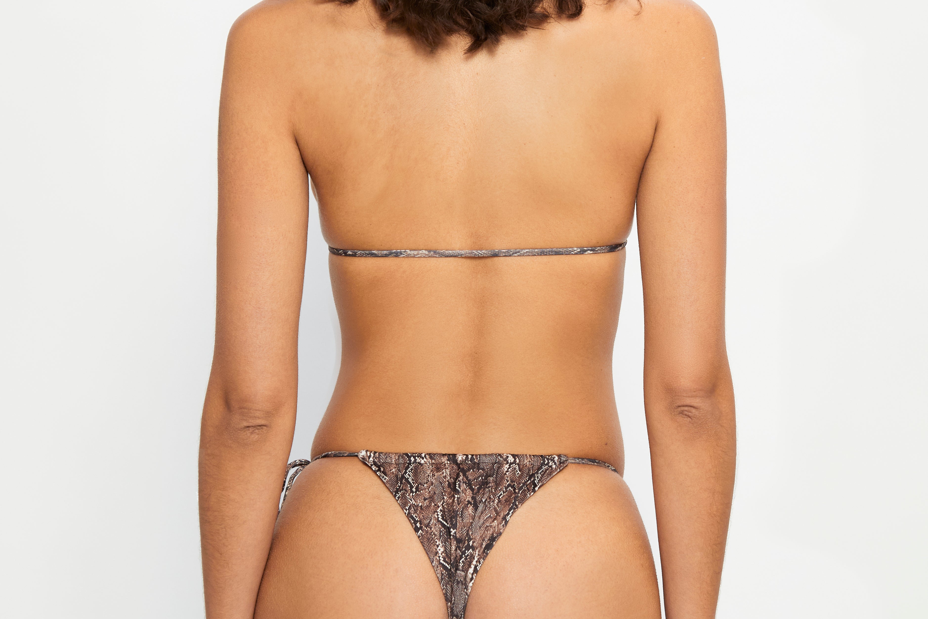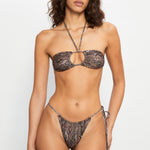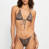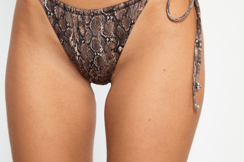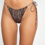 Tie-side bikini bottom in brown snake print, featuring ruched detailing at the front and back and designed with a one-sided adjustable tie.