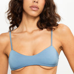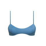 Bralette bikini top in shiny light blue, designed with adjustable ties and a silver clasp at the back.