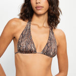 Multi-position halter bikini top in brown snake print, designed with adjustable ties at the neck and back.