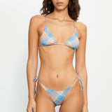 Triangle bikini top in blue with orange, yellow and pink checks, designed with adjustable ties at the neck and back. Bra pads can be added if desired.