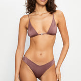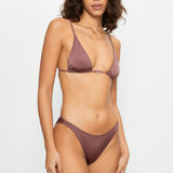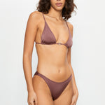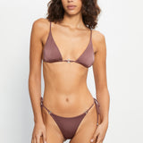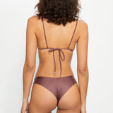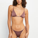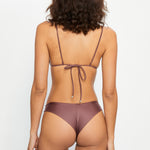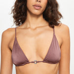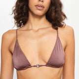 Triangle bikini top in shiny mauve brown, featuring a small silver ring at the center and designed with adjustable ties at the neck and back. Bra pads can be added if desired.