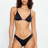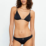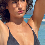 Triangle bikini top in shiny black, featuring a decorative silver bead on the left strap and designed with adjustable ties at the neck and back. Bra pads can be added if desired.