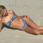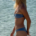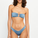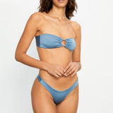 Bandeau bikini top in shiny light blue, featuring a silver ring at the front and designed with an adjustable lace at the back.
