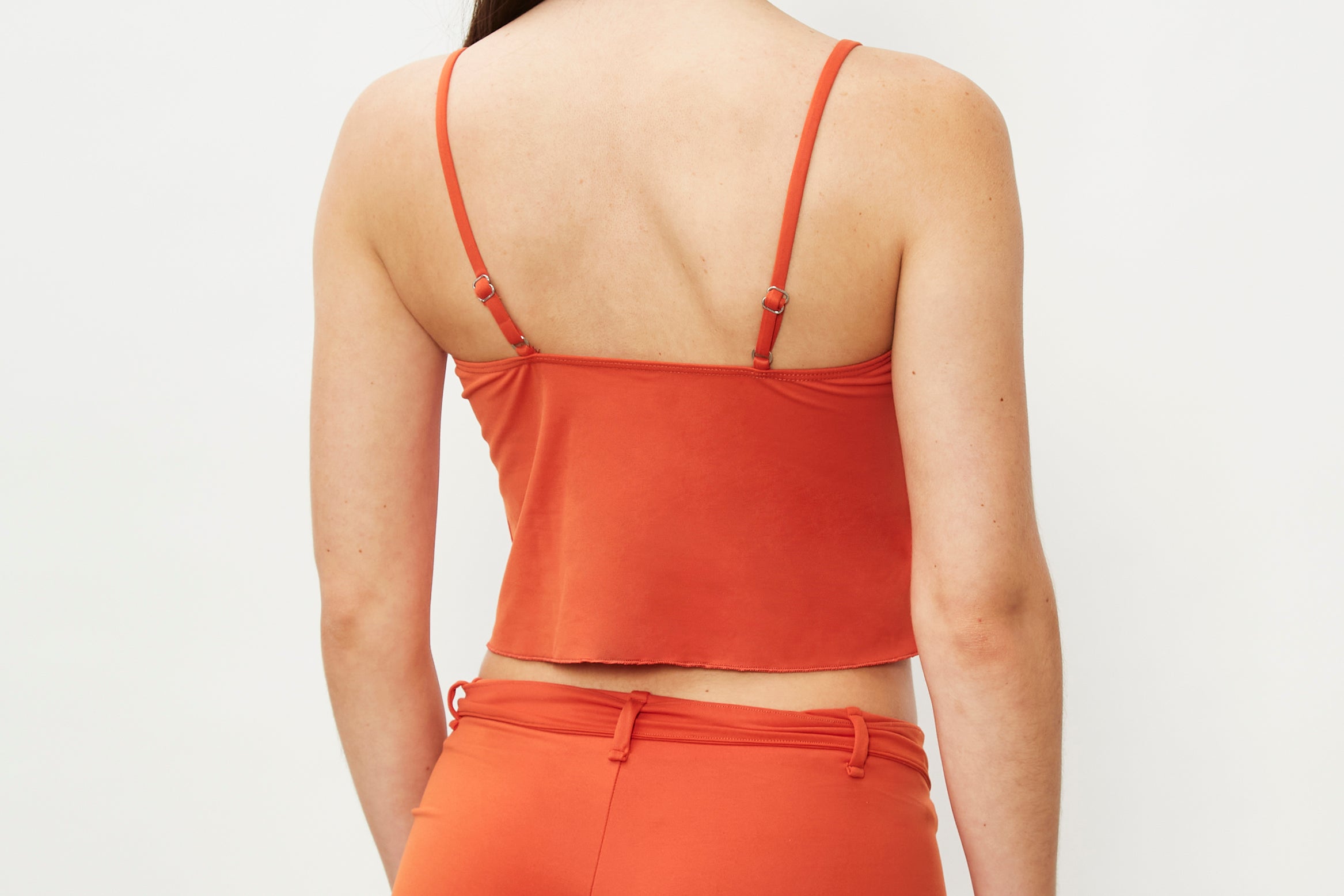 Tankini bikini top in soft red faux suede swim fabric. Featuring an antique silver detail at the front and adjustable straps.