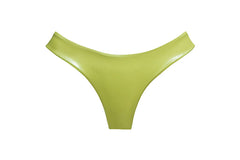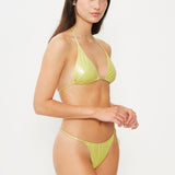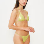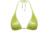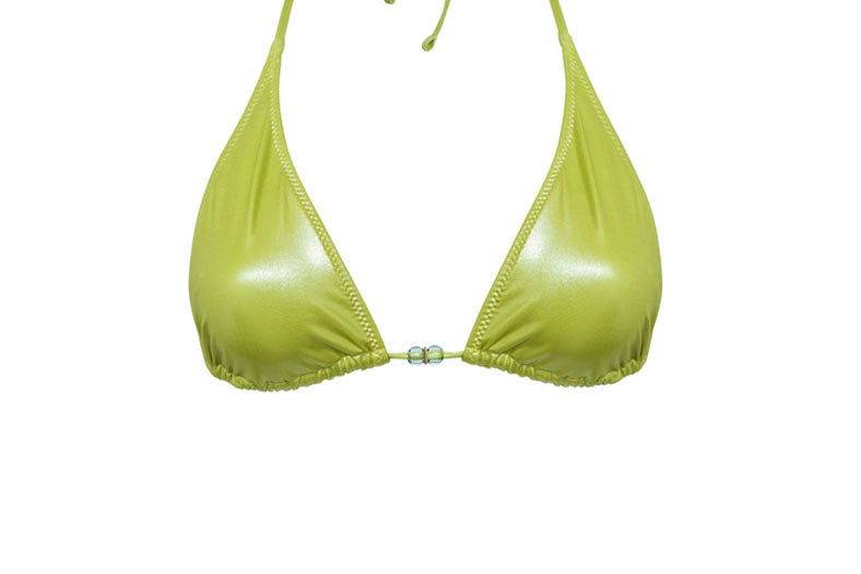 Triangle bikini top in lime green metallic shimmer. Featuring transparent green bead details and a golden ring in the center and golden caps at the strap ends.