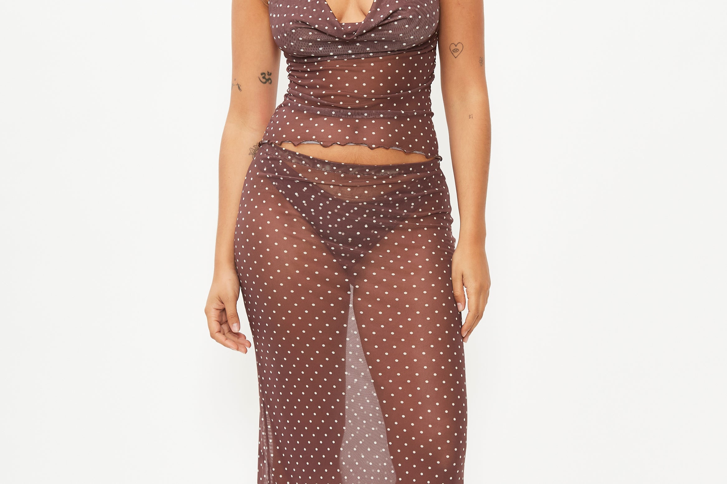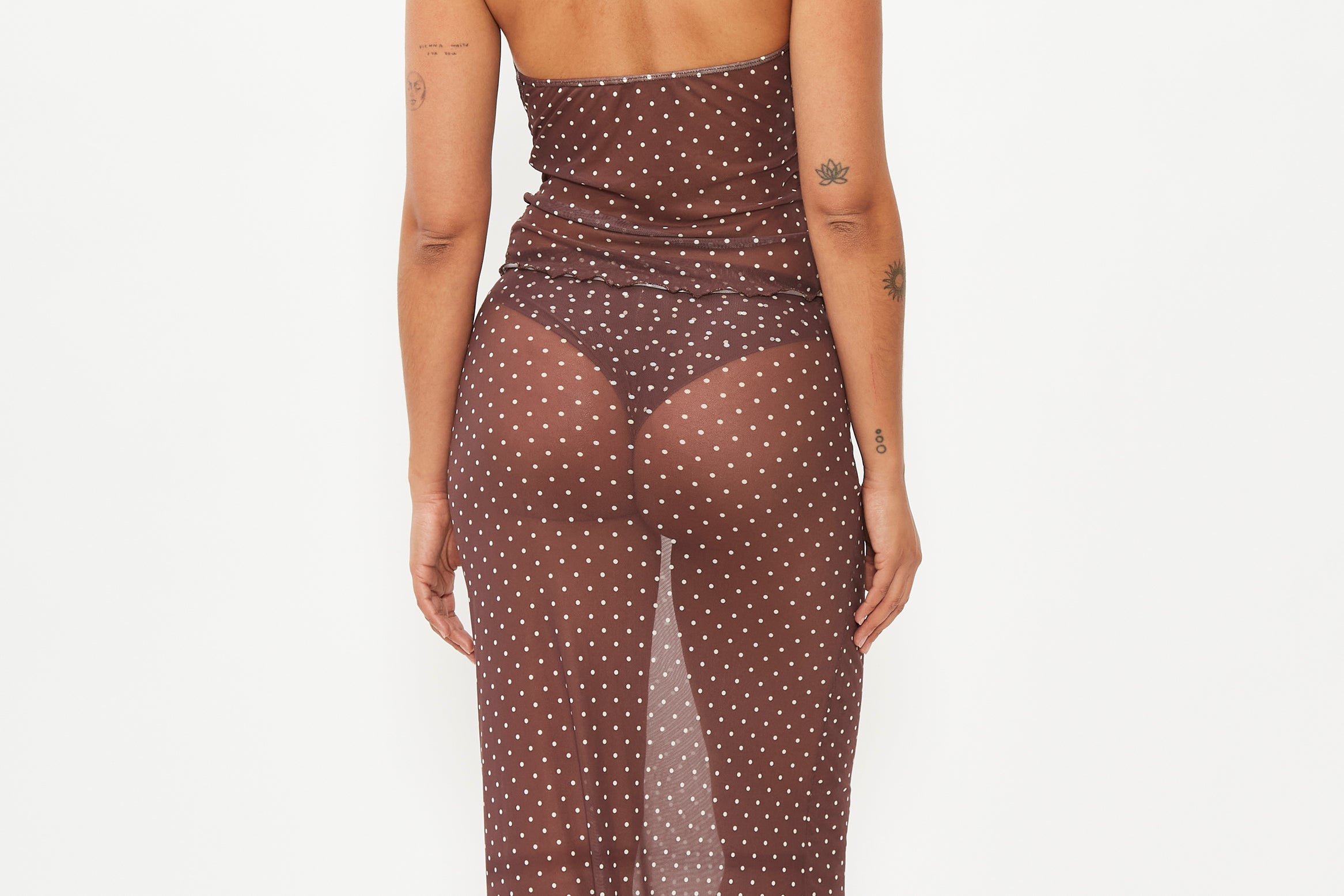 Sheer tulle polka dot top designed to wear in multiple positions. In brown with white dots. Can be worn as a halter neck, off-the-shoulder or one-shoulder style, adapting to different looks. Lightweight, semi-transparent fabric which drapes softly over the body. Perfect to pair with a matching bikini underneath.