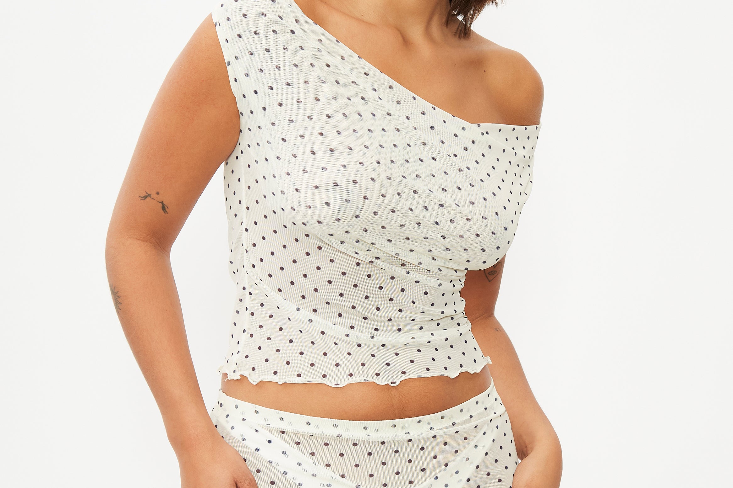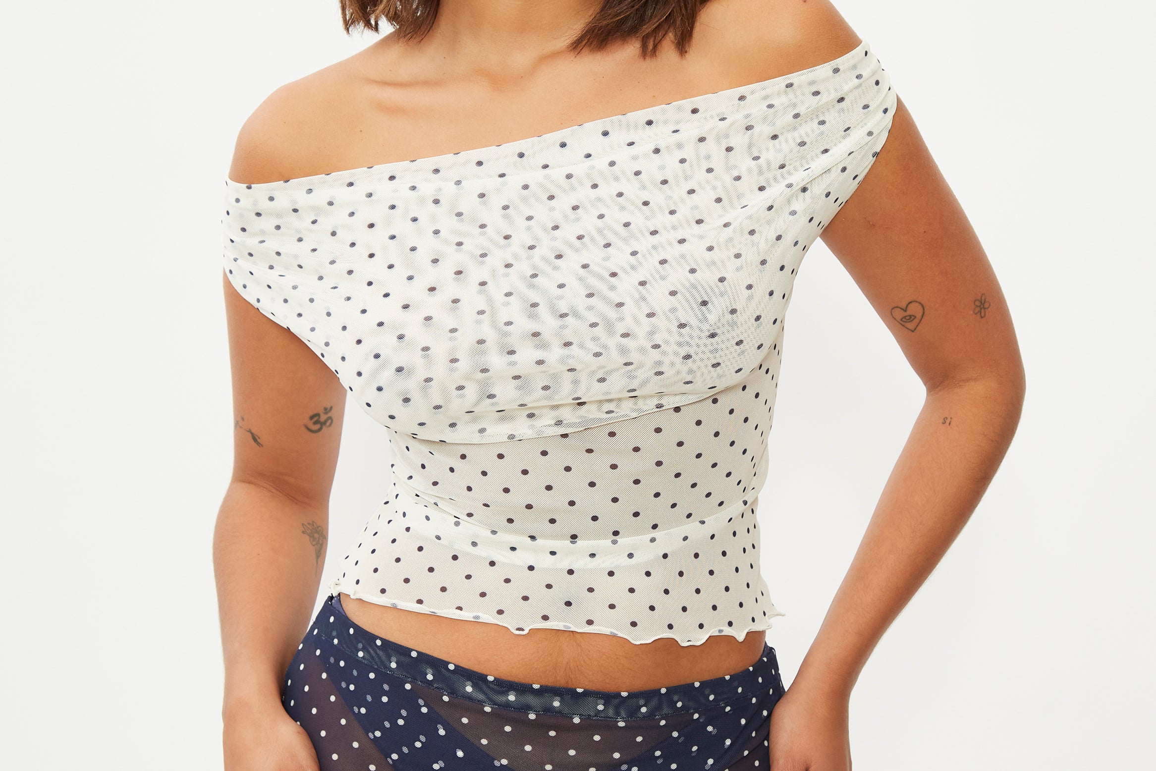 Sheer tulle polka dot top designed to wear in multiple positions. In white with navy blue dots. Can be worn as a halter neck, off-the-shoulder or one-shoulder style, adapting to different looks. Lightweight, semi-transparent fabric which drapes softly over the body. Perfect to pair with a matching bikini underneath.