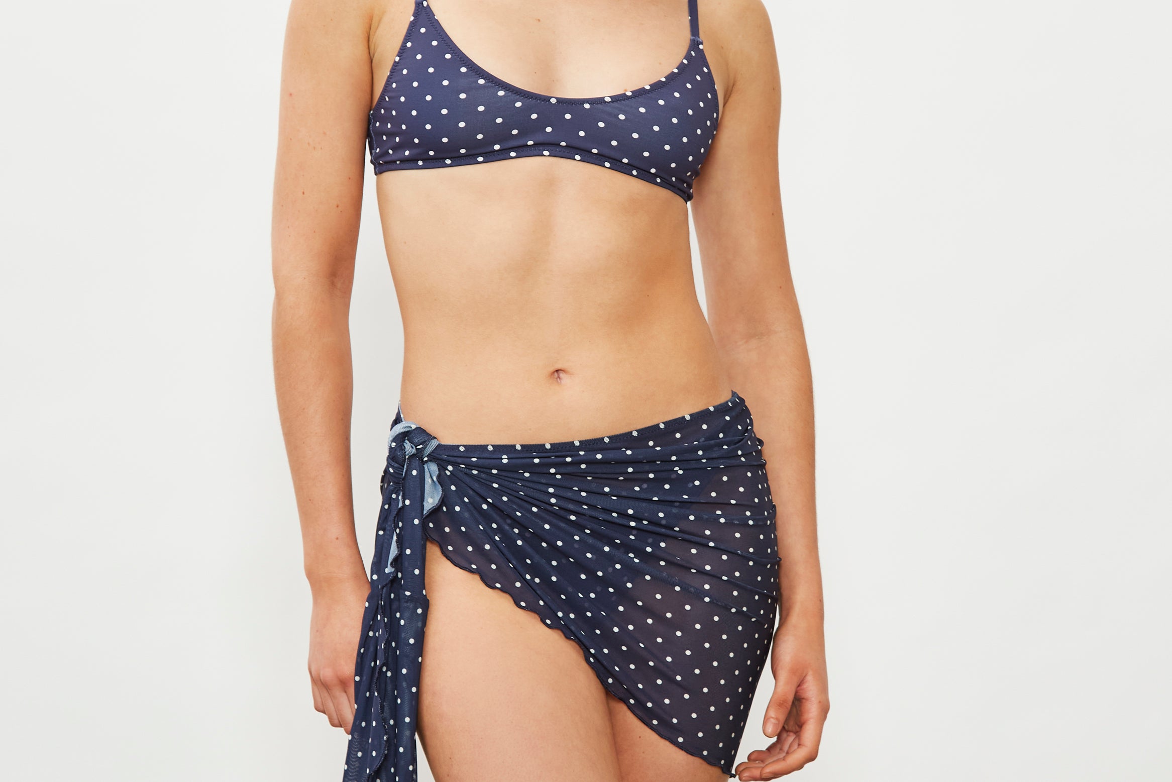 Lightweight and versatile polka dot sheer tulle sarong. In navy blue with white dots. Can be tied at the side or wrapped like a skirt and fastened with a bow at the back. Perfect to pair with a matching bikini underneath.