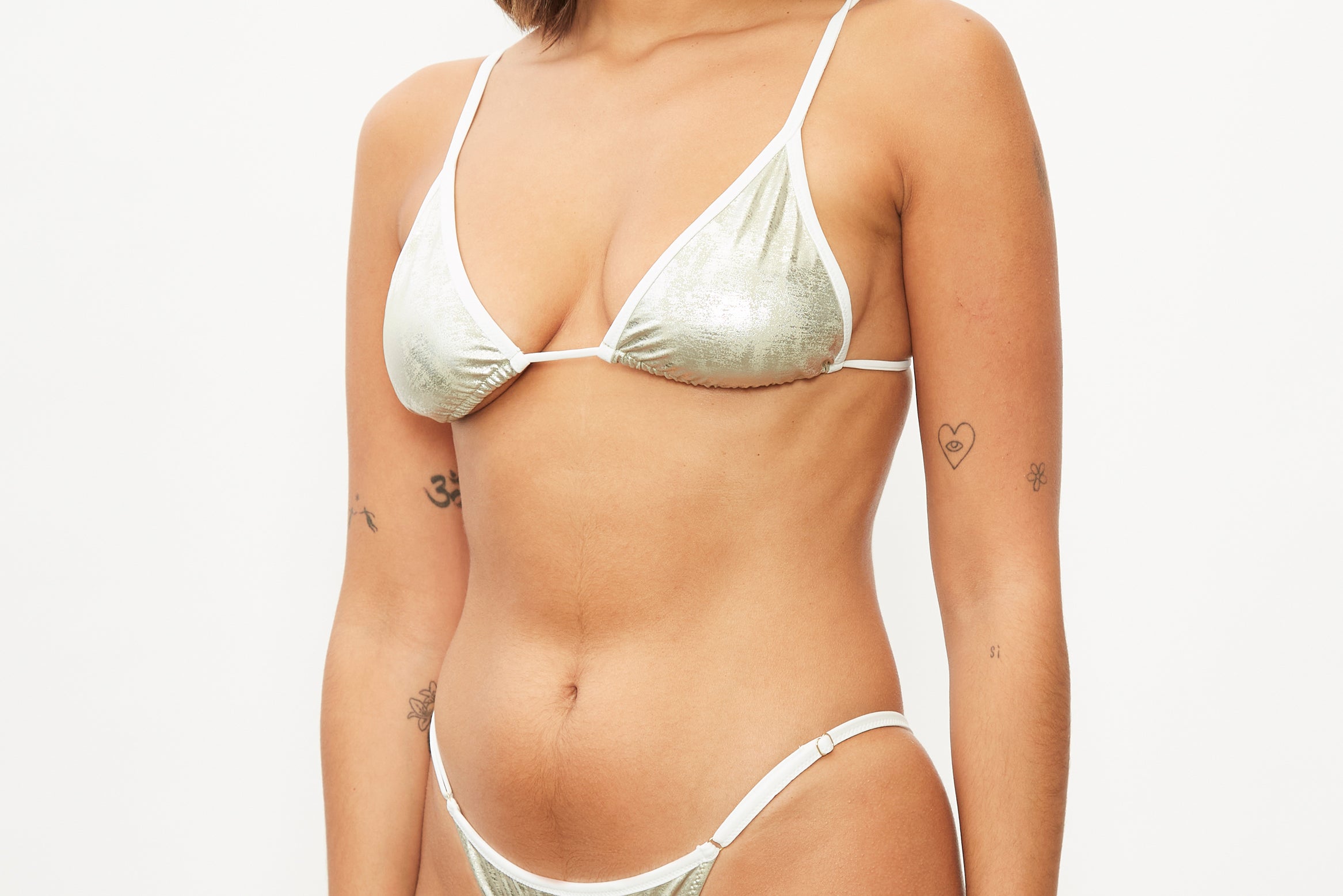 Triangle bikini top in gold metallic shimmer with a cream trim. Ties are adjustable at the neck or back. Foams can be added if desired.