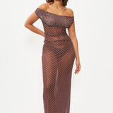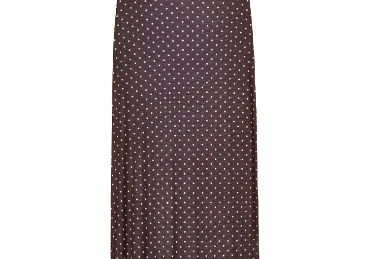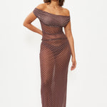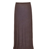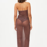 Sheer tulle polka dot maxi skirt. In brown with white dots. With an elastic waistband for a comfortable and flattering fit. Long, body-hugging cut perfect to pair with a matching bikini underneath.