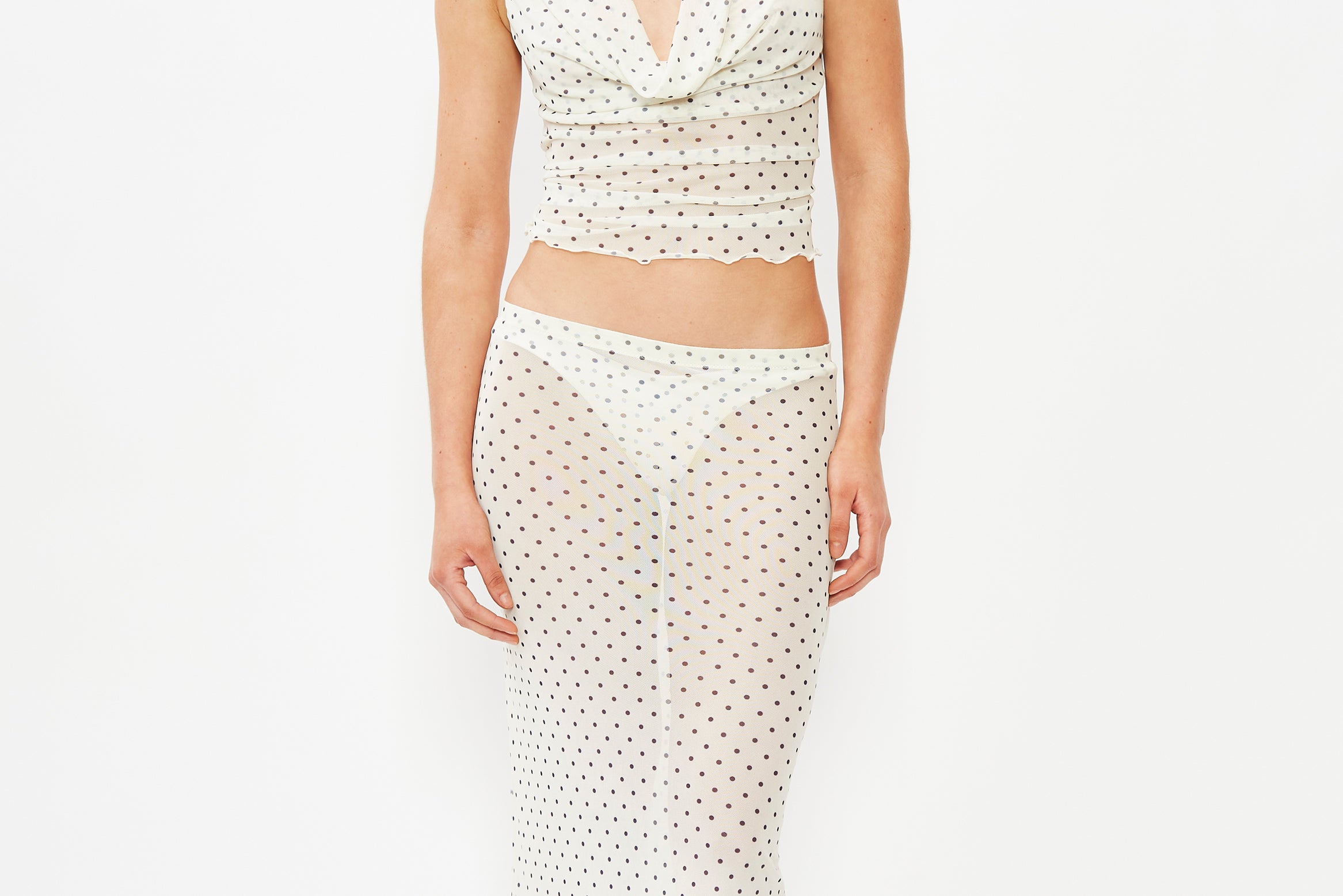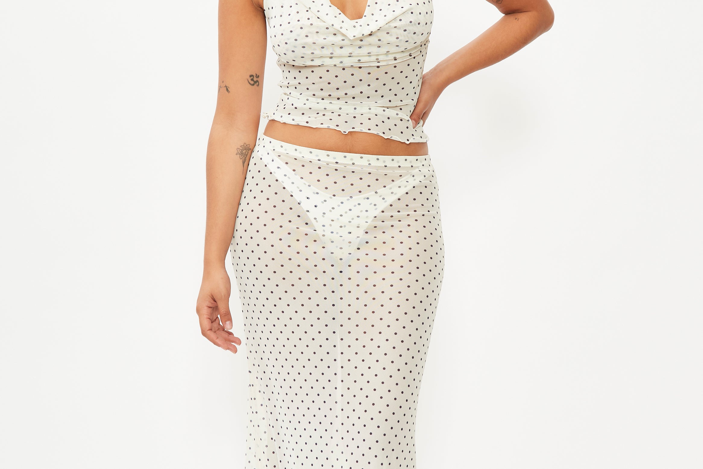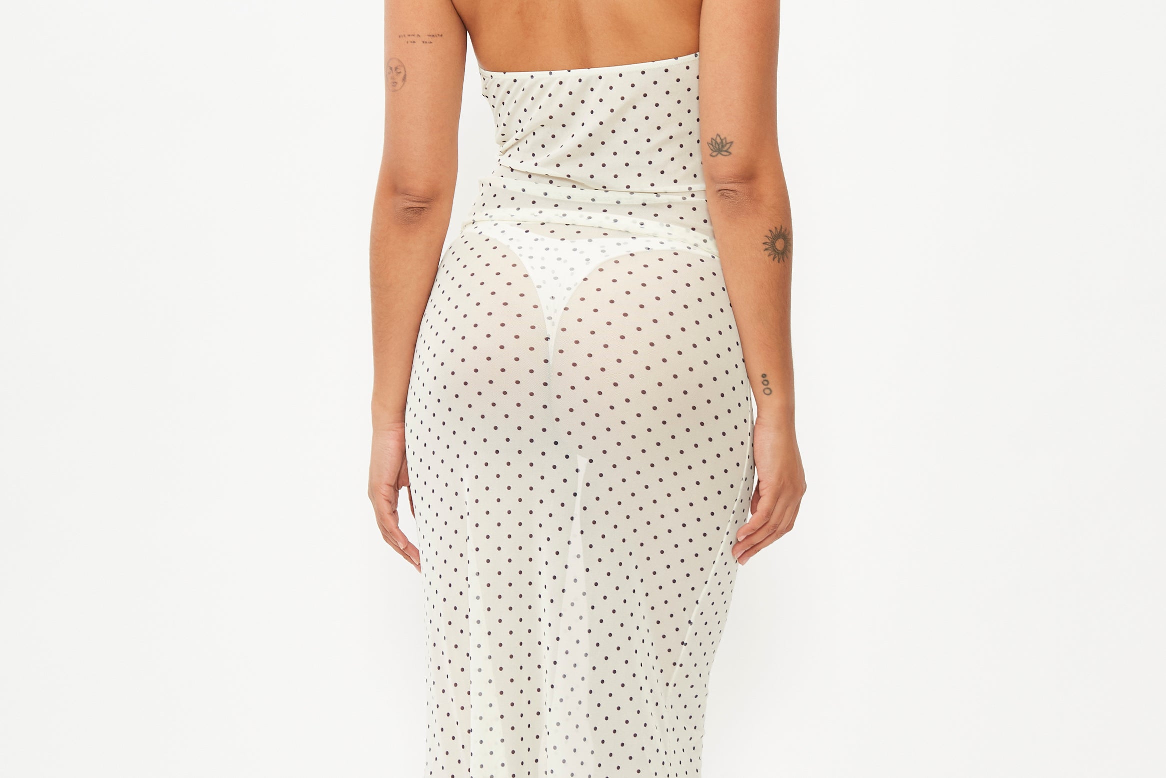 Sheer tulle polka dot maxi skirt. In white with navy blue dots. With an elastic waistband for a comfortable and flattering fit. Long, body-hugging cut perfect to pair with a matching bikini underneath.