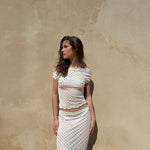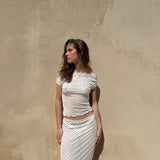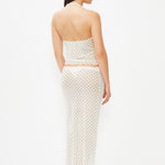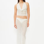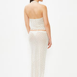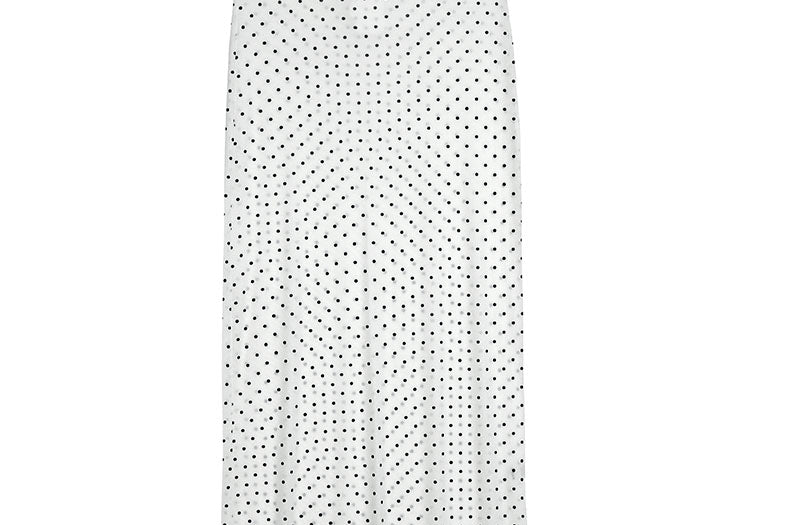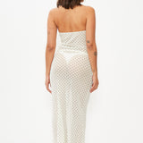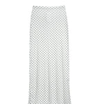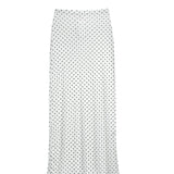 Sheer tulle polka dot maxi skirt. In white with navy blue dots. With an elastic waistband for a comfortable and flattering fit. Long, body-hugging cut perfect to pair with a matching bikini underneath.