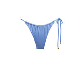 Braguita de bikini pequeña en azul cielo metálico brillante, con fruncido en el frente y la parte trasera. Con terminales dorados en los extremos de los tirantes. Ajustable con un lazo a un lado.