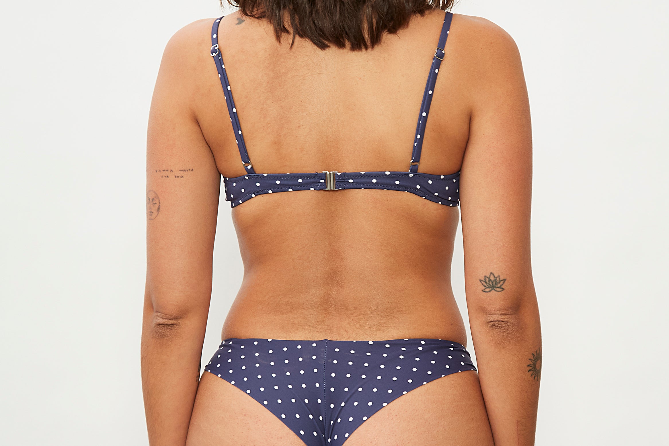 Braguita de bikini brasileña en estampado de lunares azul marino y blanco roto.
