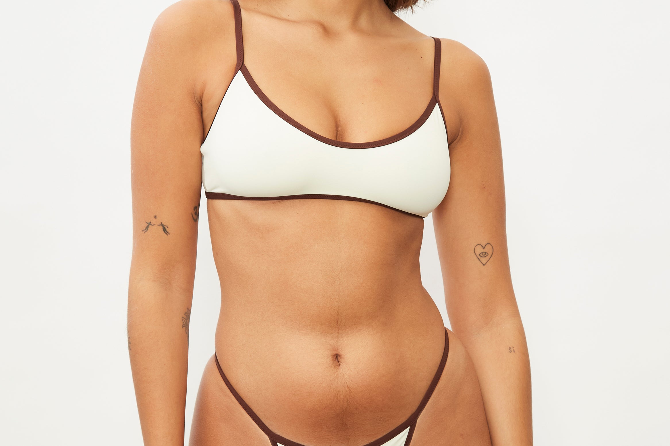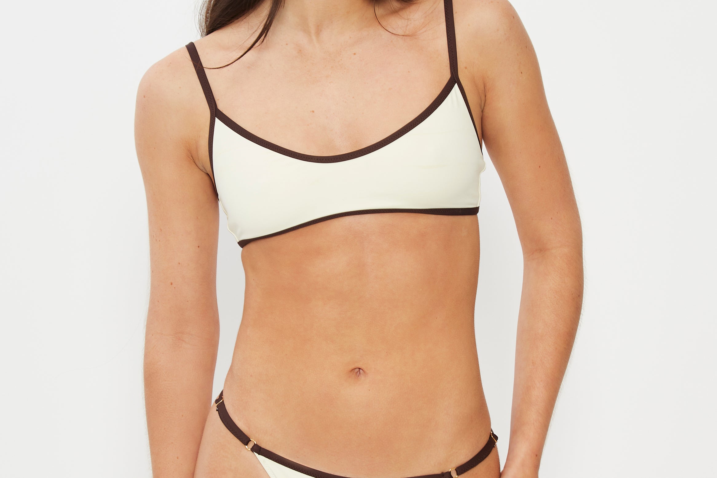 Top de bikini deportivo en color marfil con ribete marrón. Tiras ajustables. Cierre dorado en la espalda. Nota: el tejido puede volverse sutilmente transparente al mojarse, según el tono de piel y el contraste.