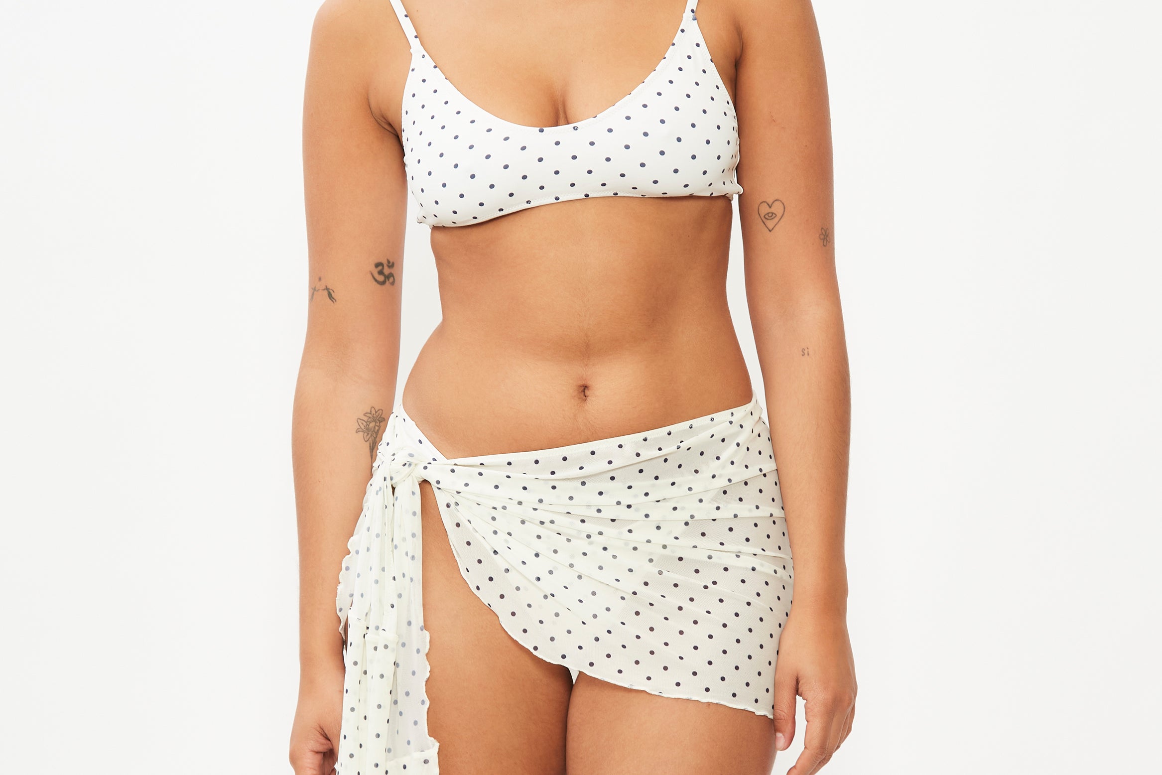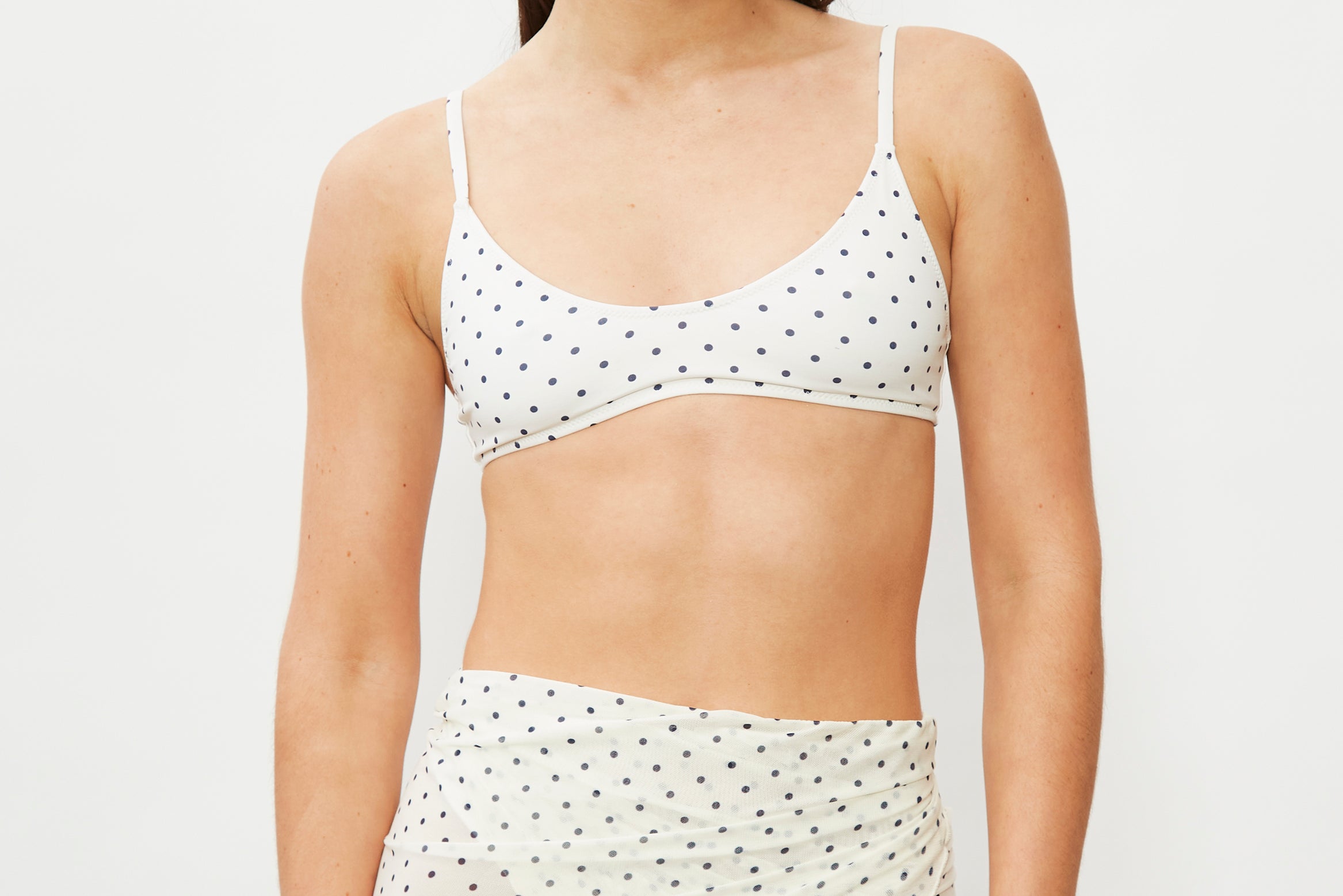 Top de bikini deportivo en Estampado de lunares azul marino y blanco roto. Lazos ajustables y cierre plateado en la espalda.
