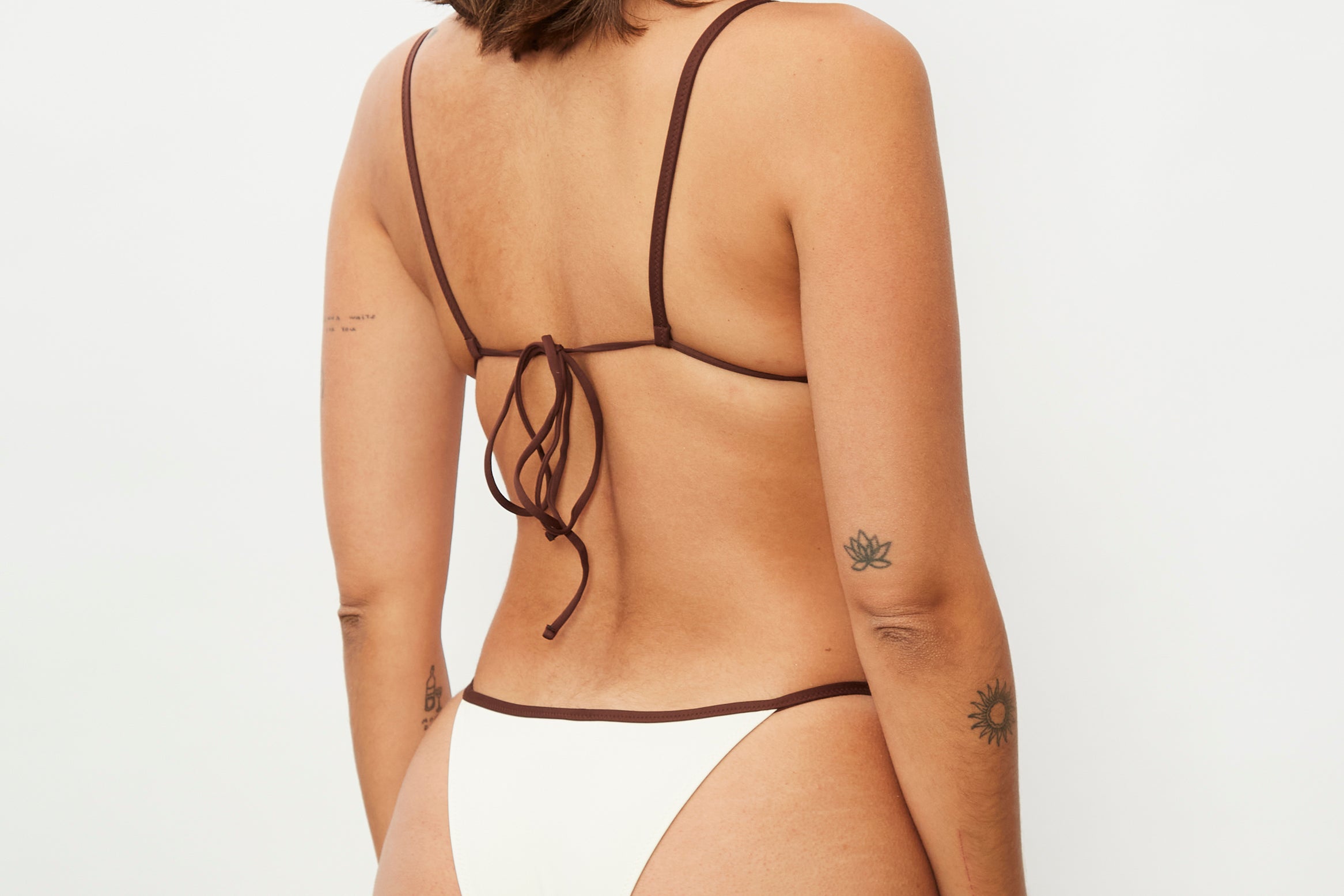Braguita de bikini de estilo clásico en color marfil con ribete marrón. Cinturilla ajustable. Nota: el tejido puede volverse sutilmente transparente al mojarse, según el tono de piel y el contraste.