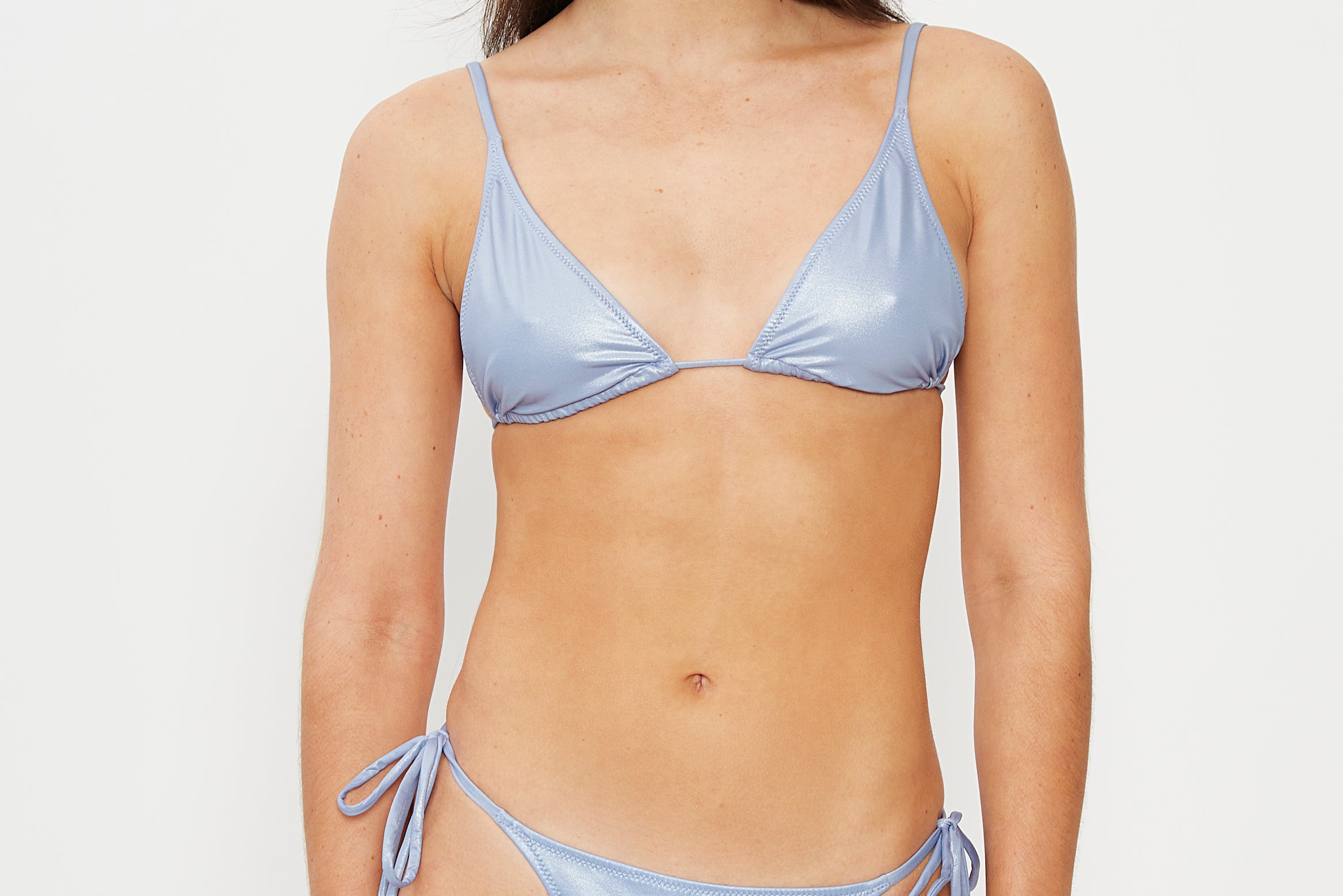 Braguita de bikini en azul cielo metálico brillante, con fruncido en la parte media trasera. Con terminales dorados en los extremos de los tirantes. Los lazos son ajustables a los lados.