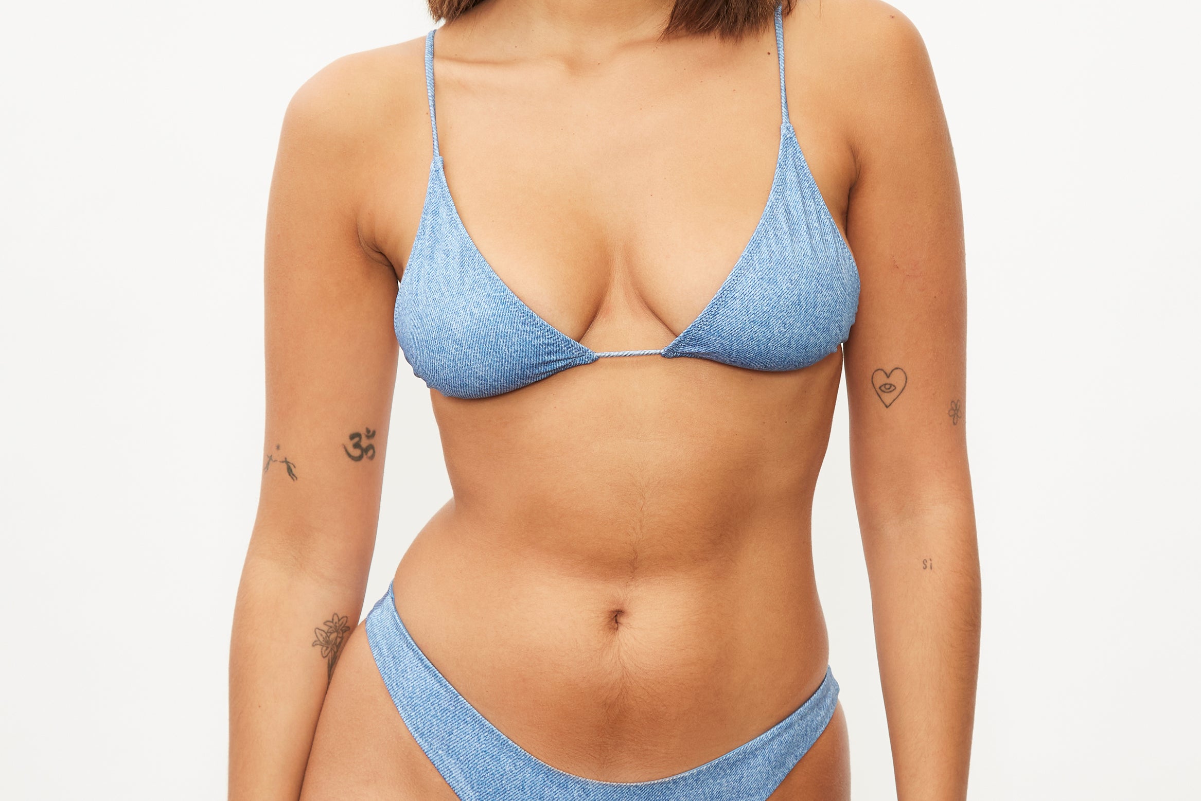 Top cortinilla multi-posición en estampado tejano. Con tirante recto a la espalda o atado con lazada al cuello. Con abalorios dorados en los extremos del tirante bajo-pecho. Apto para poner foams de relleno.