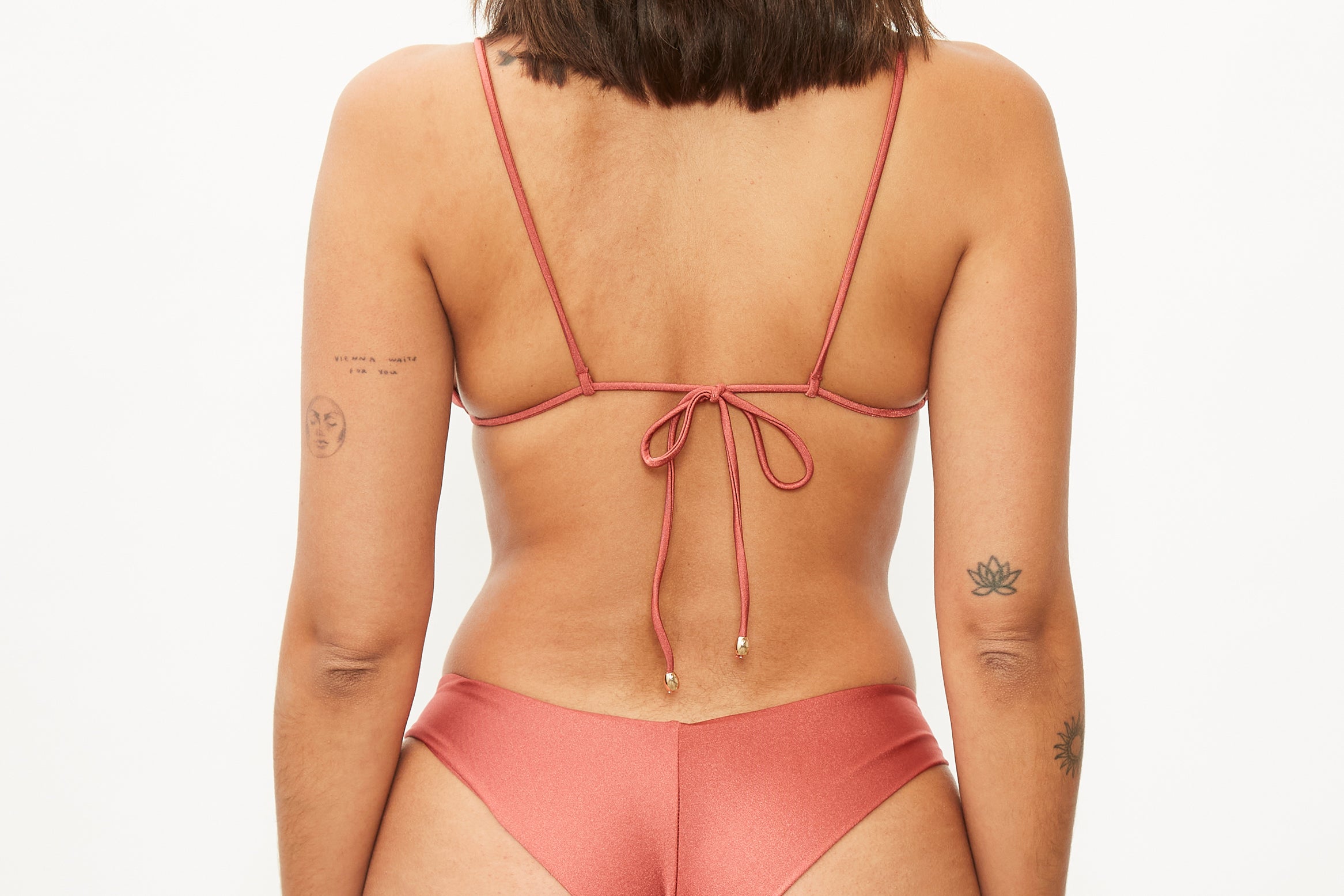Top de bikini triangular en color granate. Con detalles dorados en los extremos de los tirantes.