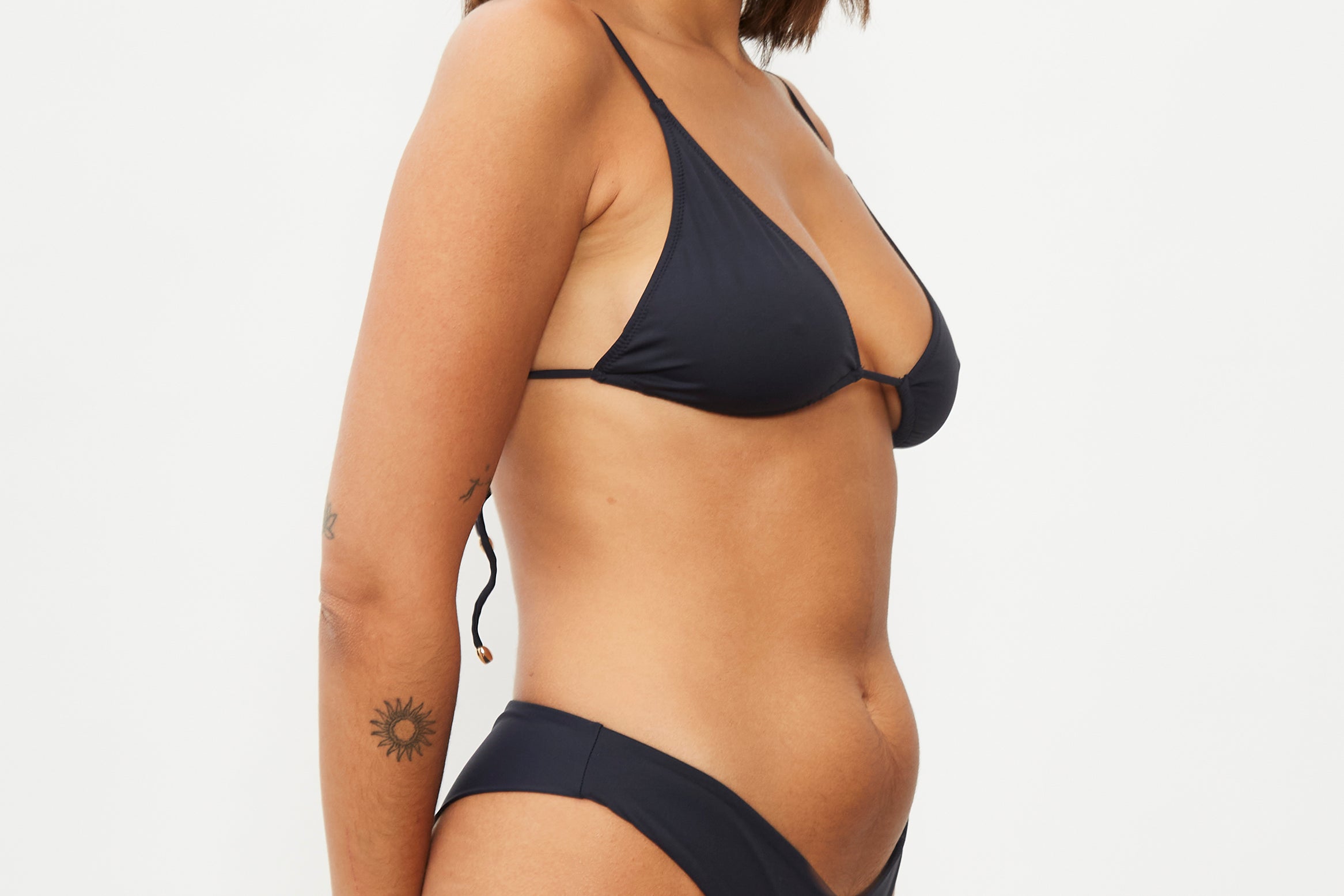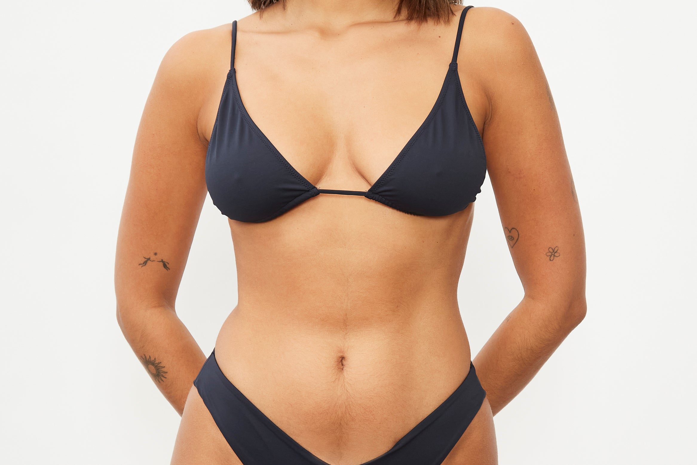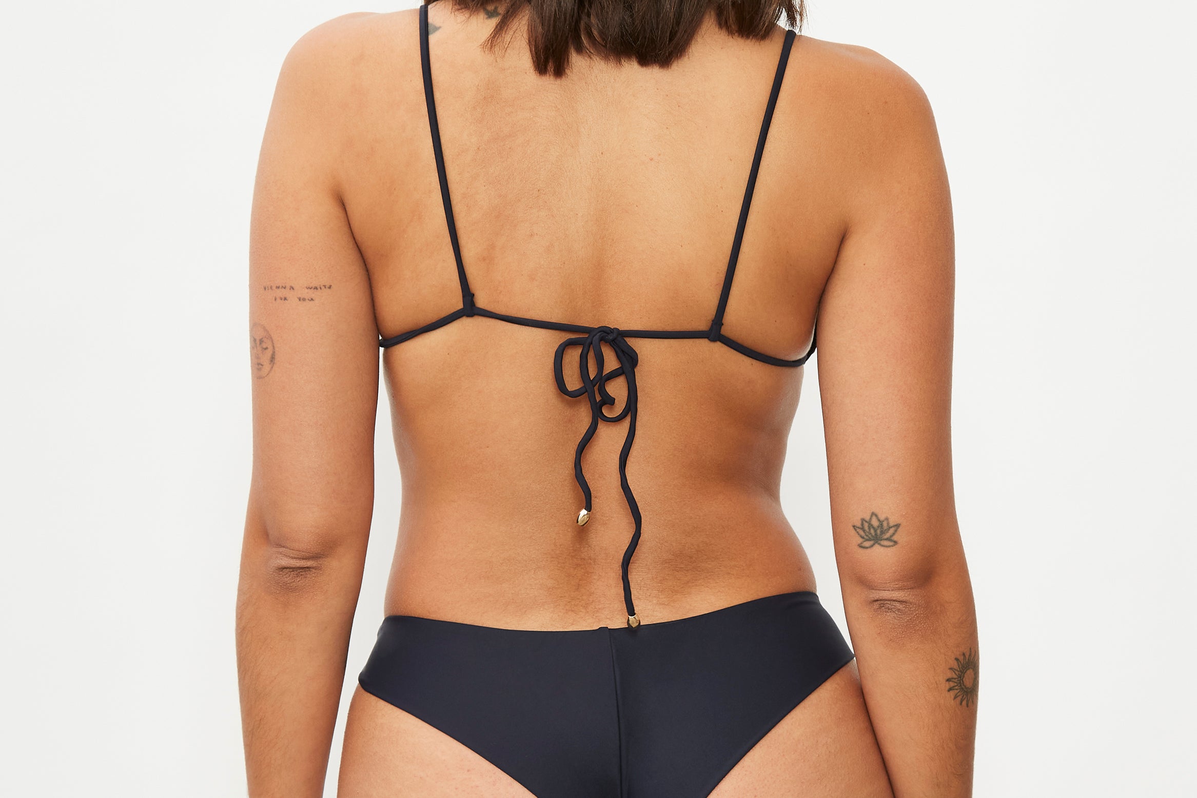 Top de bikini triangular azul marino. Con detalles dorados en los extremos de los tirantes.