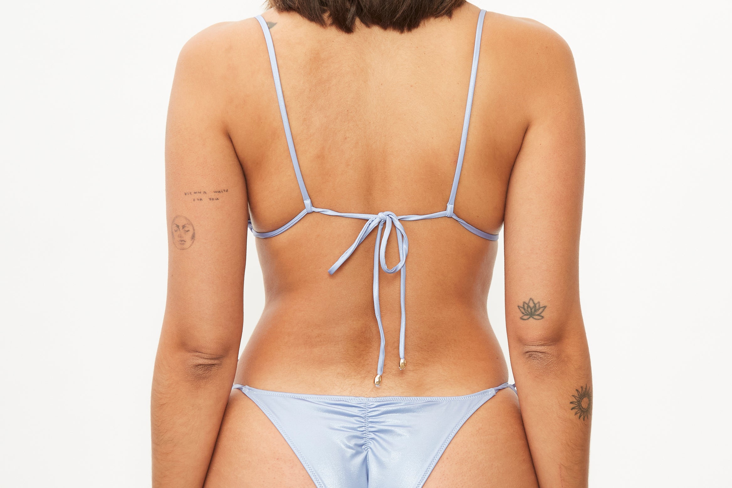 Top de bikini triangular en azul cielo metálico brillante. Con terminales dorados en los extremos de los tirantes.