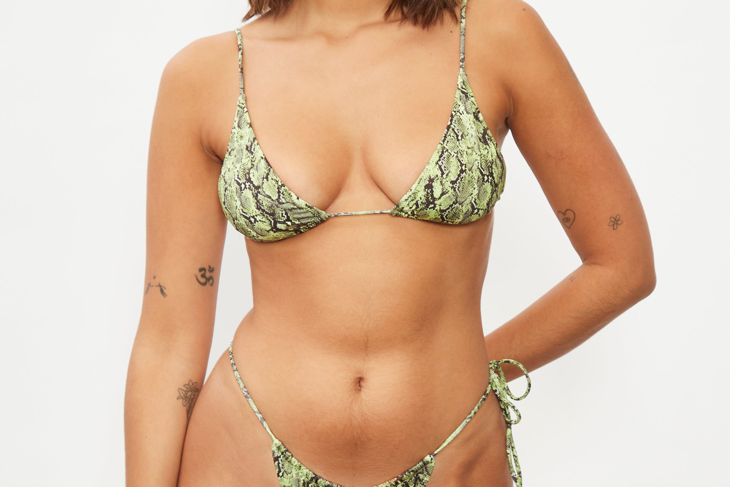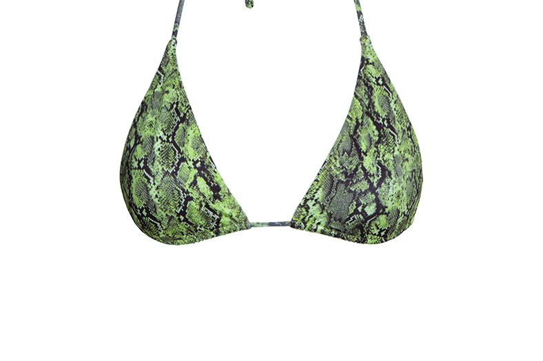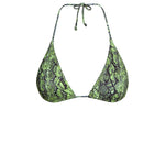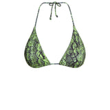 Top de bikini triangular con estampado de serpiente verde. Con detalles dorados en los extremos de los tirantes.