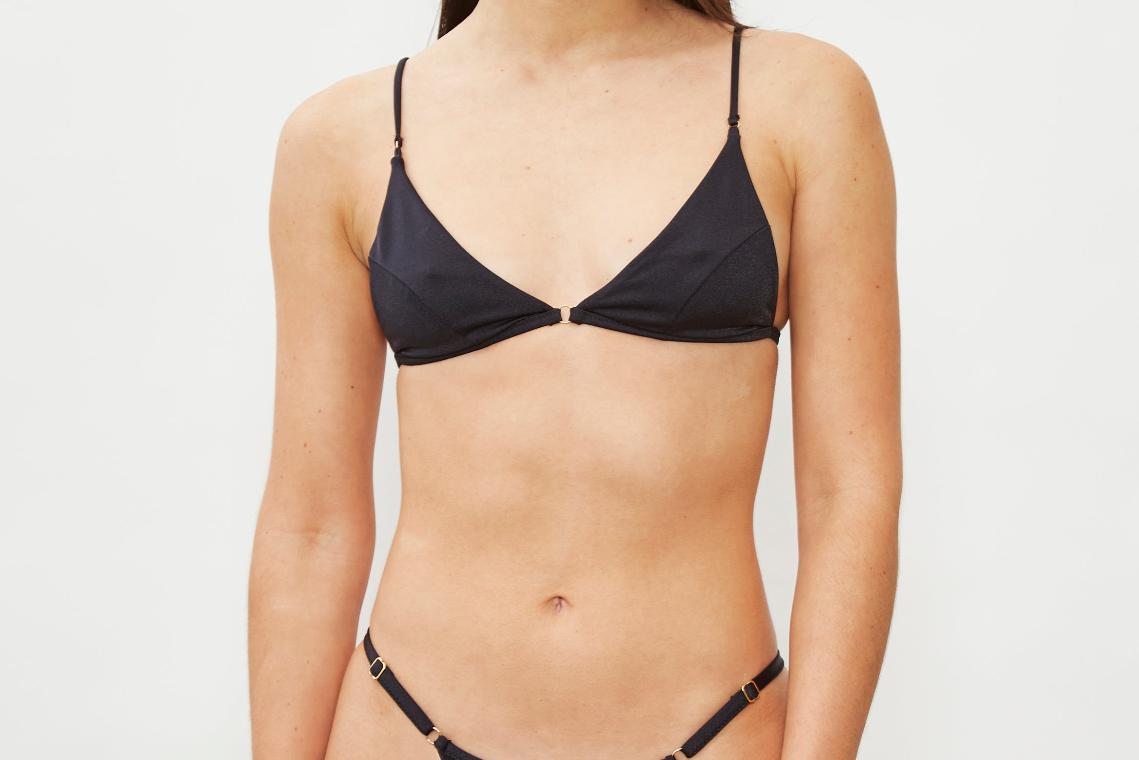 Braguita de talle alto en negro brillante con detalle de anillas doradas en la parte delantera.