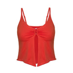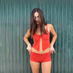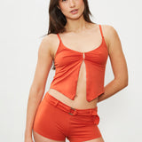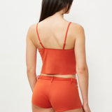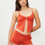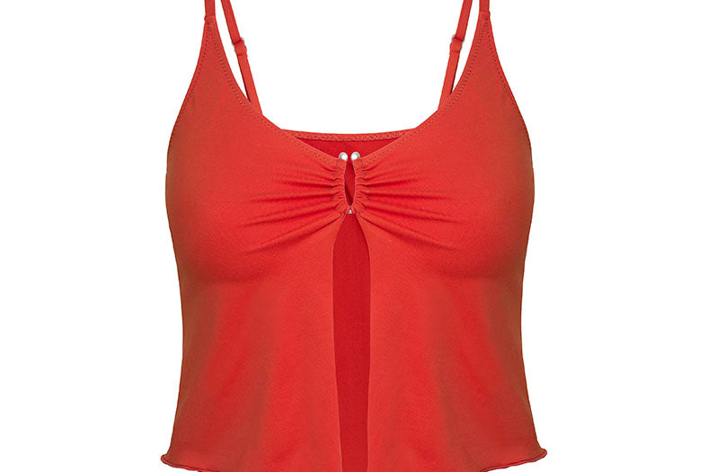 Tankini bikini top in soft red faux suede swim fabric. Featuring an antique silver detail at the front and adjustable straps.