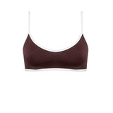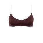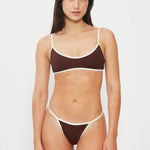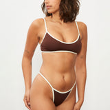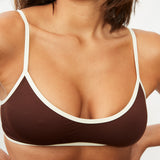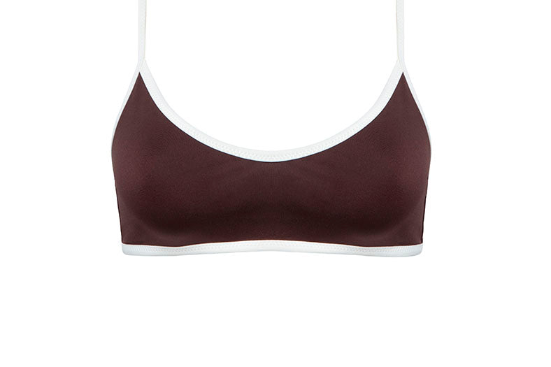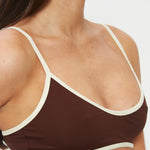 Sport bikini top in brown with an ivory trim. Ties are adjustable. With a golden clasp at the back.