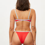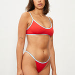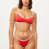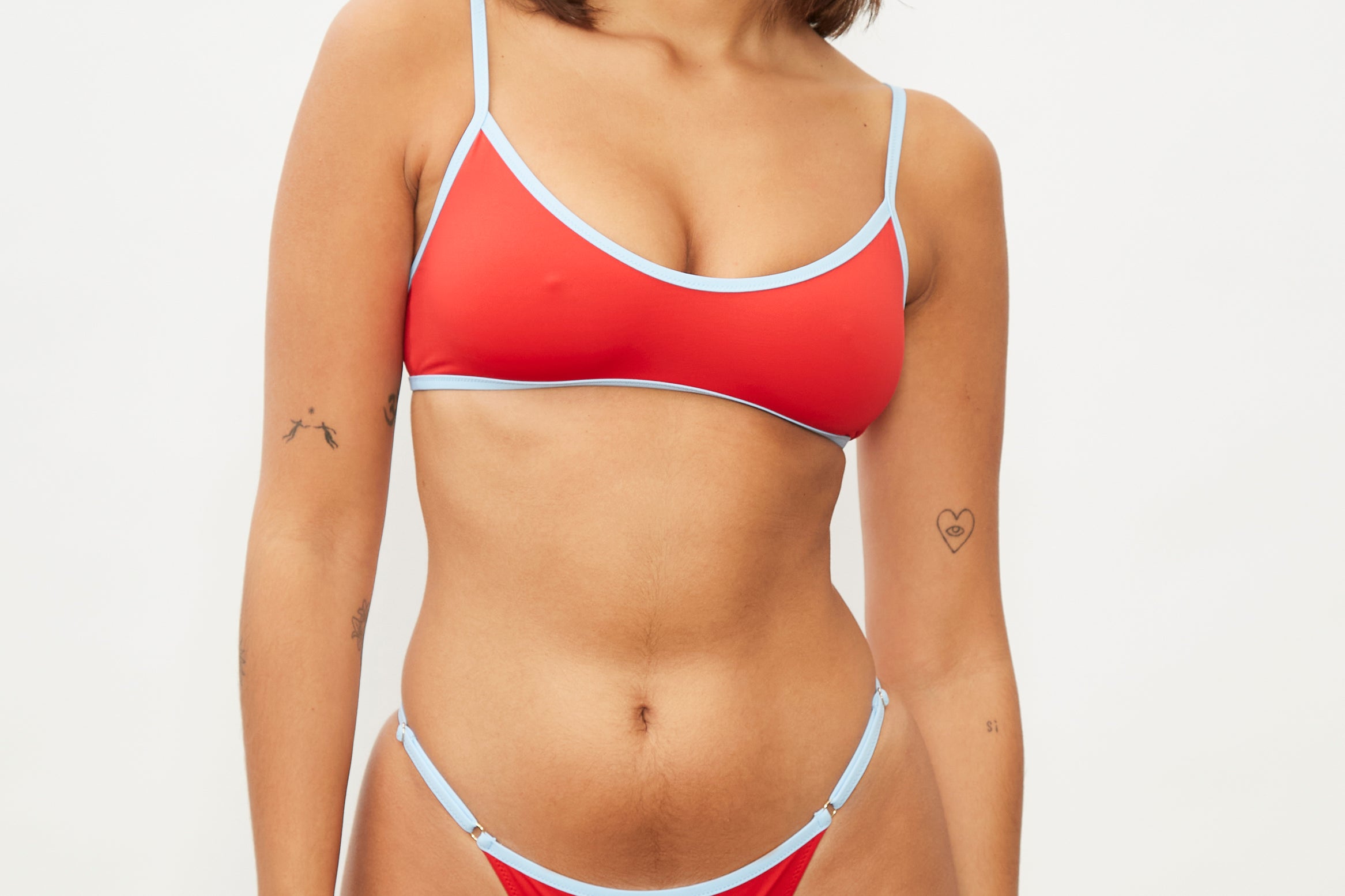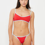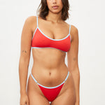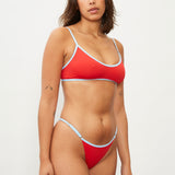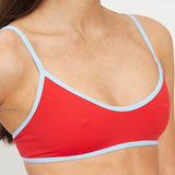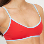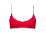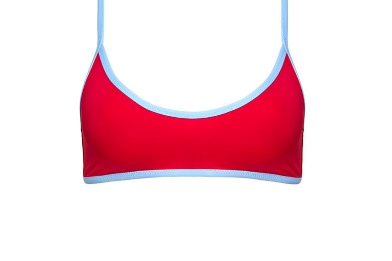 Sport bikini top in red with a sky blue trim. Ties are adjustable. With a golden clasp at the back.