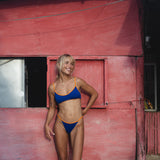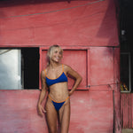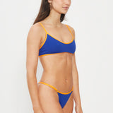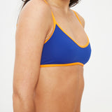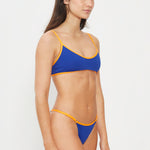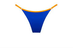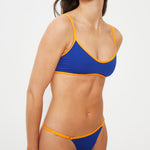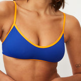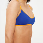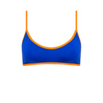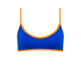 Sport bikini top in blue with an orange trim. Ties are adjustable. With a golden clasp at the back.