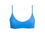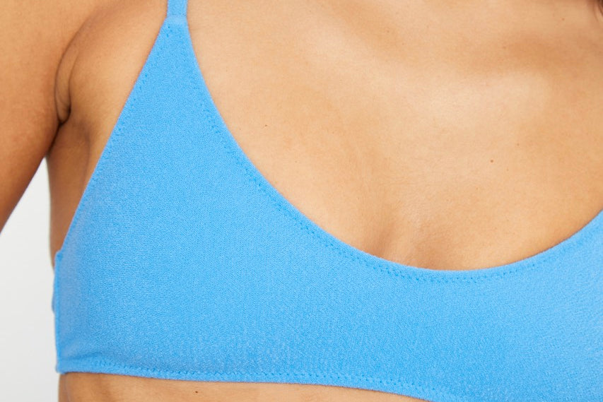 Bralette bikini top in blue terry fabric with a towel-like texture, designed with adjustable ties and a silver clasp at the back.