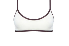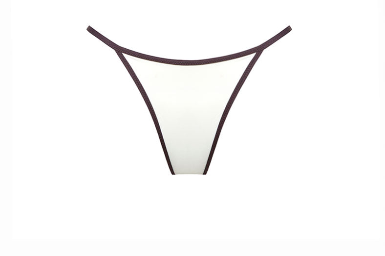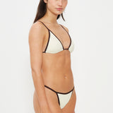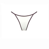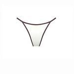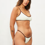 Thong bikini bottom in ivory with a brown trim. Adjustable waistband. Note: Fabric may become subtly sheer when wet, depending on skin tone and contrast.