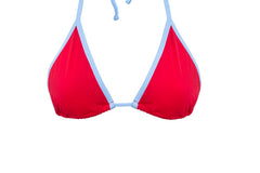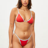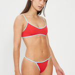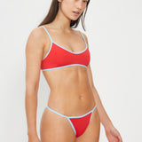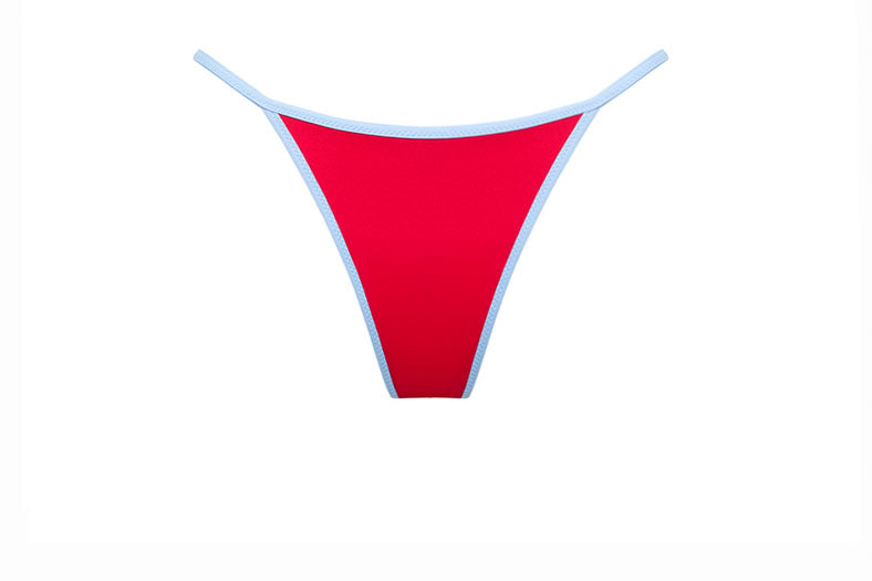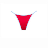 Thong bikini bottom in red with a blue sky trim. Adjustable waistband.