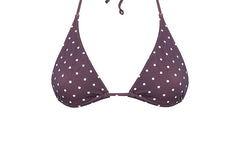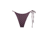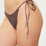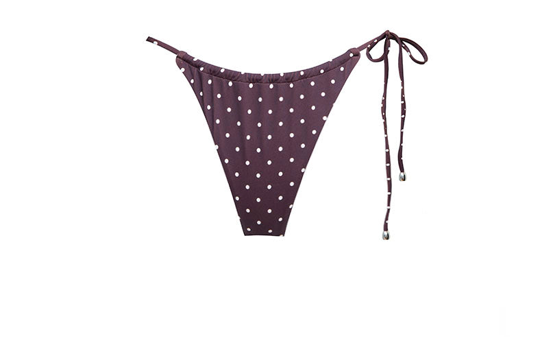 Small bikini bottom in brown and off-white polka dot print, featuring a ruched front and back. Adjustable with a one-sided tie finished with a pair of silver caps.