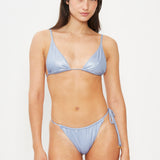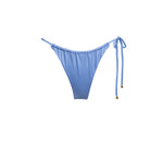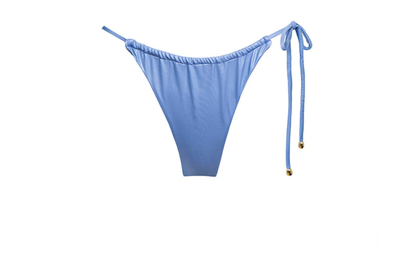 Small bikini bottom in sky blue metallic shimmer with a ruched front and back. Featuring golden caps at the end of the straps. Adjustable with a one-sided lace.