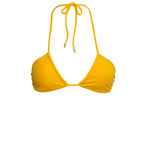 Multi-position bikini top in yellow terry fabric with a towel-like texture, featuring decorative silver beads and designed with adjustable ties at the neck and back.
