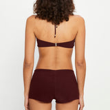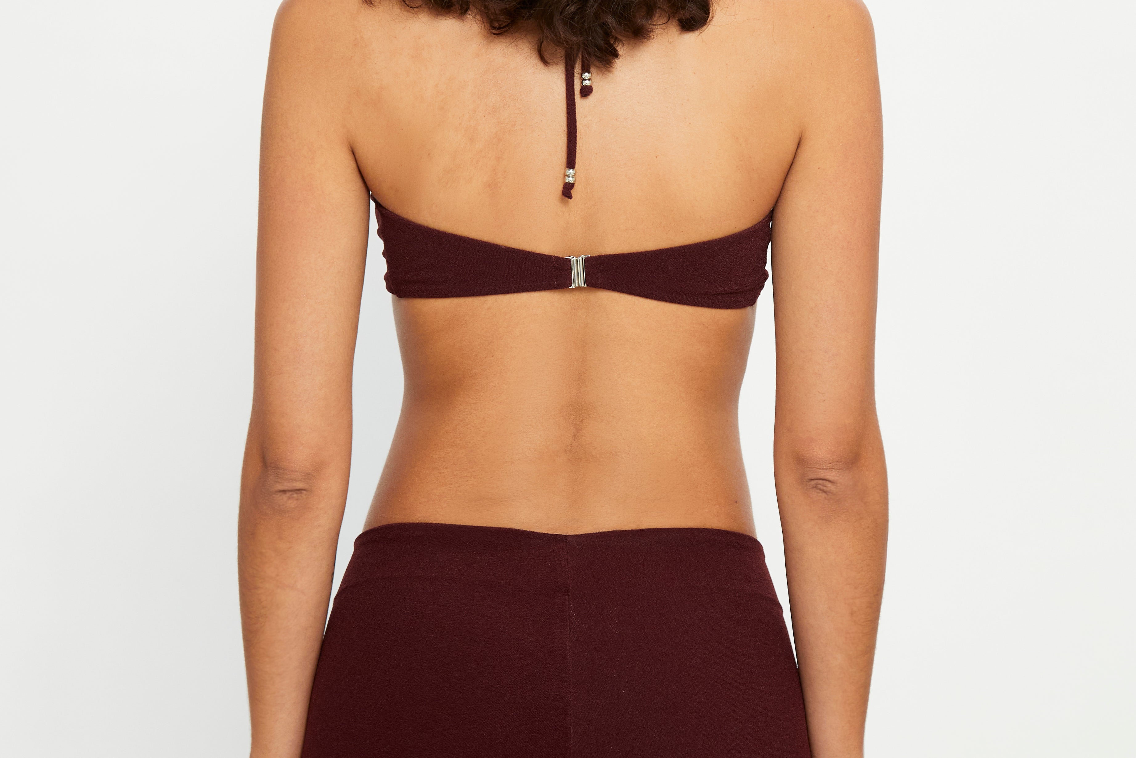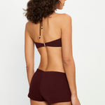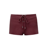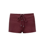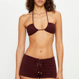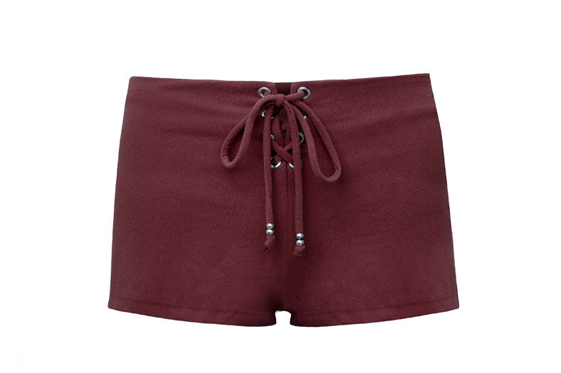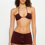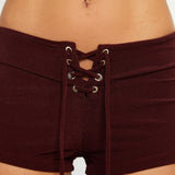 High-waisted shorts in brown terry fabric with a towel-like texture, designed with adjustable eyelet lace ties and silver bead details.