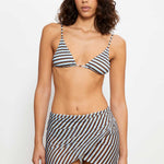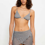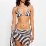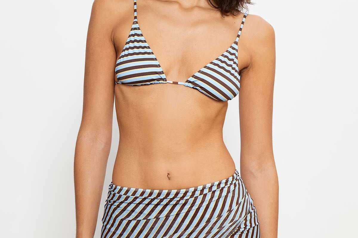 Sheer tulle sarong in blue, brown and yellow stripes, designed for versatile styling. Crafted from lightweight fabric that can be tied at the side or wrapped as a skirt and fastened with a bow at the back, perfect to pair with a matching bikini underneath.
