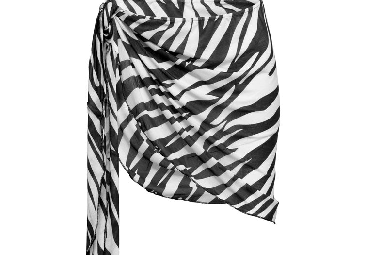 Zebra print sheer tulle sarong designed for versatile styling. Crafted from lightweight fabric that can be tied at the side or wrapped as a skirt and fastened with a bow at the back, perfect to pair with a matching bikini underneath.