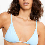 Triangle bikini top in baby blue, designed with adjustable ties at the neck and back. Bra pads can be added if desired.