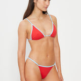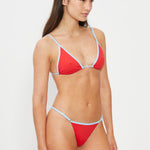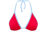 Triangle bikini top in red with a sky blue trim. Ties are adjustable at the neck or back. Foams can be added if desired.