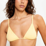 Triangle bikini top in butter yellow, designed with adjustable ties at the neck and back. Bra pads can be added if desired.