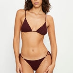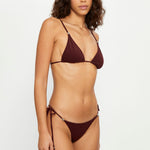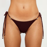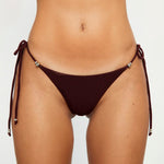 Tie-side bikini bottom in brown terry fabric with a towel-like texture, featuring silver bead details and designed with adjustable side ties.