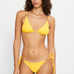 Tie-side bikini bottom in yellow terry fabric with a towel-like texture, featuring silver bead details and designed with adjustable side ties.