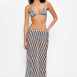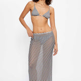Sheer tulle maxi skirt in blue, brown and yellow stripess, designed with an elastic waistband and a long, body-hugging silhouette, perfect to pair with a matching bikini underneath.