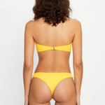 Brazilian bikini bottom in yellow terry fabric with a towel-like texture.